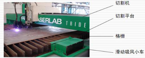 在切割平臺一側安裝方形吸風道,吸風道上方裝有一個可隨切割機一起移動的吸風小車,并在切割平臺的另一側裝有吹風風機。滑動吸風小車切割頭吹風風機安裝在切割機沿衡量方向的同一直線上。利用切割平臺上的格柵板與切割鋼板形成“煙氣通道”。切割鋼板時,吹風風機將產生的切割煙塵通過“煙氣通道”吹向吸風小車吸風口,進入方形吸氣風道,最后進入凈化器主機進行切割煙塵凈化處理。